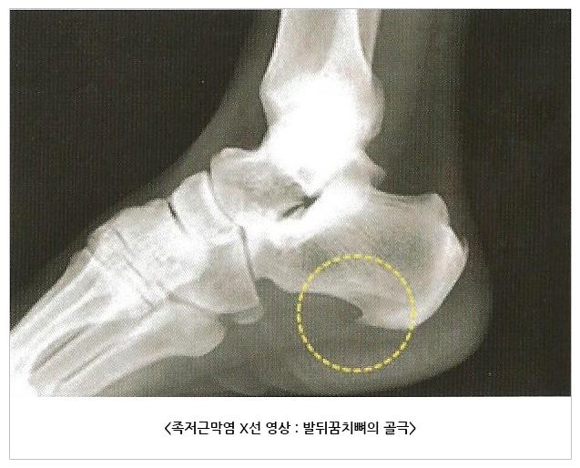 통증은 주로 발뒤꿈치 안쪽에 발생하는 경우가 대부분이고, 누르면 통증이 발생하기도 합니다.