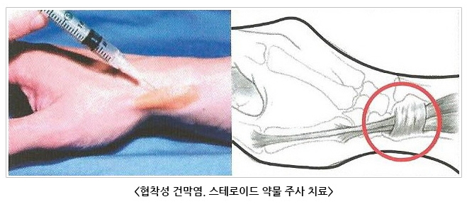 스테로이드 약물 주시를 힘줄 통로 부위에 맞기도 하는데, 3개월 정도 효과가 지속되지만 재발하는 경우가 종종 있습니다.