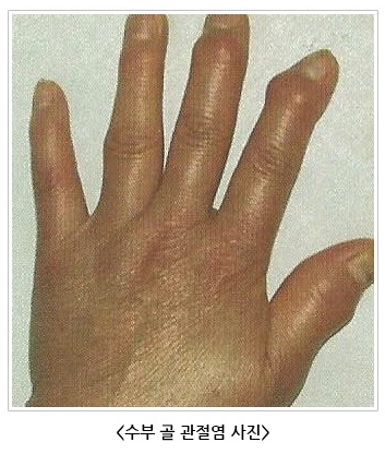 수부 골관절염이 잘 생기는 부위는 손의 마지막 마디이고, 다음으로 끝에서 둘째 마디 입니다.
