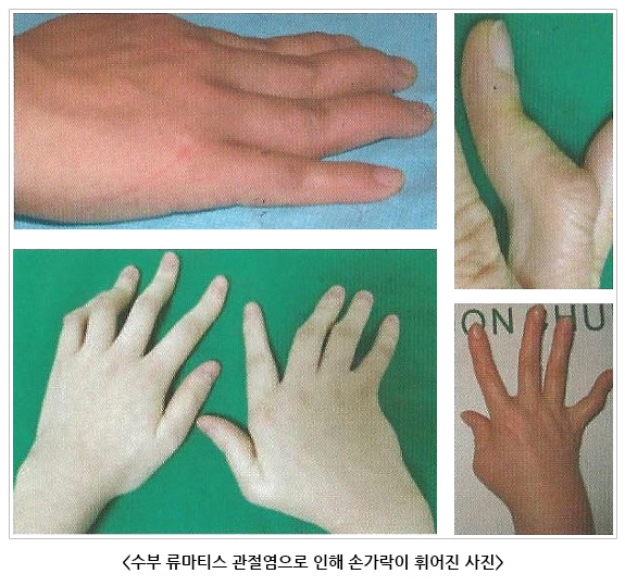 류마티스 관절염은 간혹 치료 시기를 놓쳐 관절연골이 망가져 버리면, 마디가 휘거나 붓게 되고, 힘줄이 늘어나거나 끊어져 손가락이 완전히 펴지지 않거나, 혹은 너무 젖혀지는 변형이 생기기도 합니다.